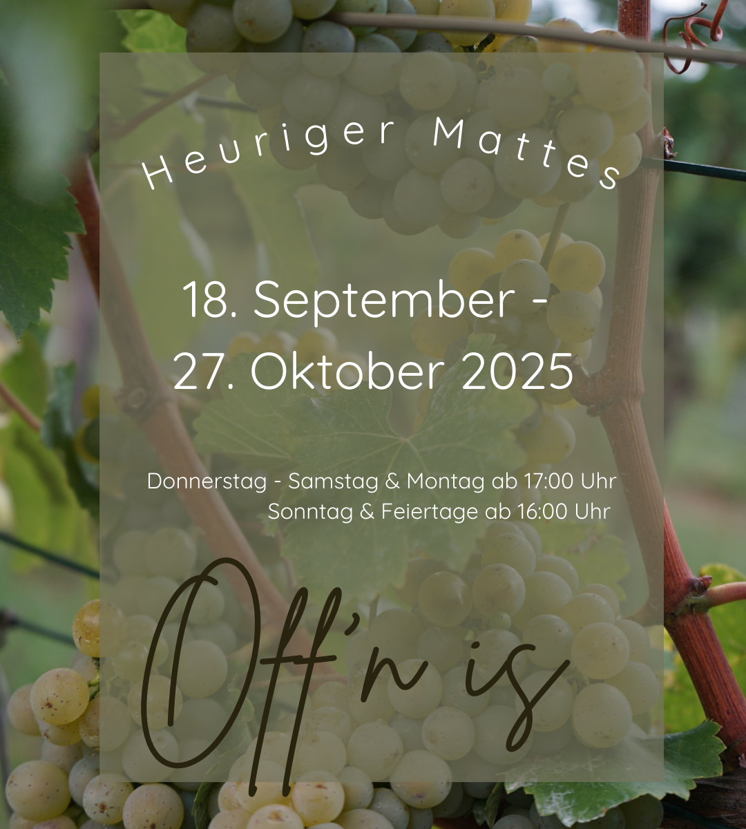 Ab Donnerstag, den 18. September ist unser Heuriger Mattes endlich wieder geöffnet. Ingesamt sechs Wochen, also bis zum 27. Oktober, freuen wir uns jeweils von Donnerstag bis Montag ab 17:00 Uhr, außer Sonntag & Feiertage bereits ab 16:00 Uhr, in der Großstelzendorfer Kellergasse über Euren Besuch.